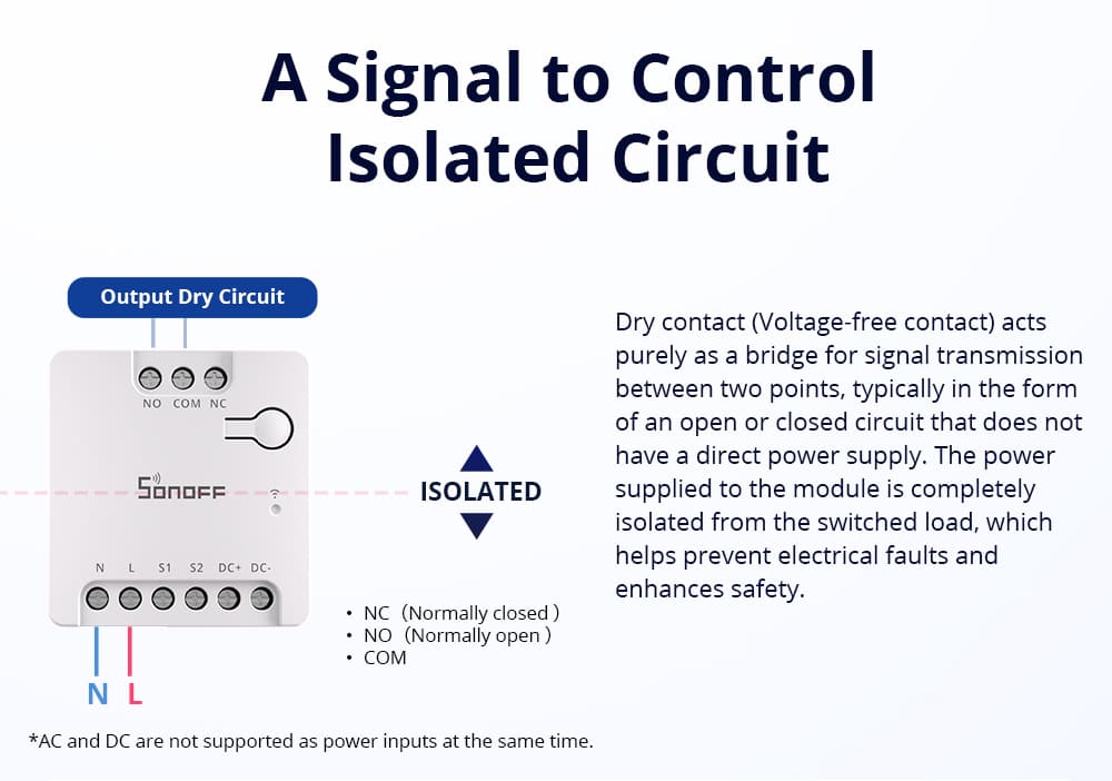 - MINI-D is a Wi-Fi dry contact smart switch that supports AC/DC power supply. It can be used to control motors, garage doors, and other dry contact input devices, offering remote control, voice control, and other functions through the APP. With Matter protocol support, it can work across various third-party platforms like Amazon Alexa, Google Home, Apple Home and Home Assistant, making it easier for users to manage their smart home ecosystem, and enjoy a seamless smart home experience.