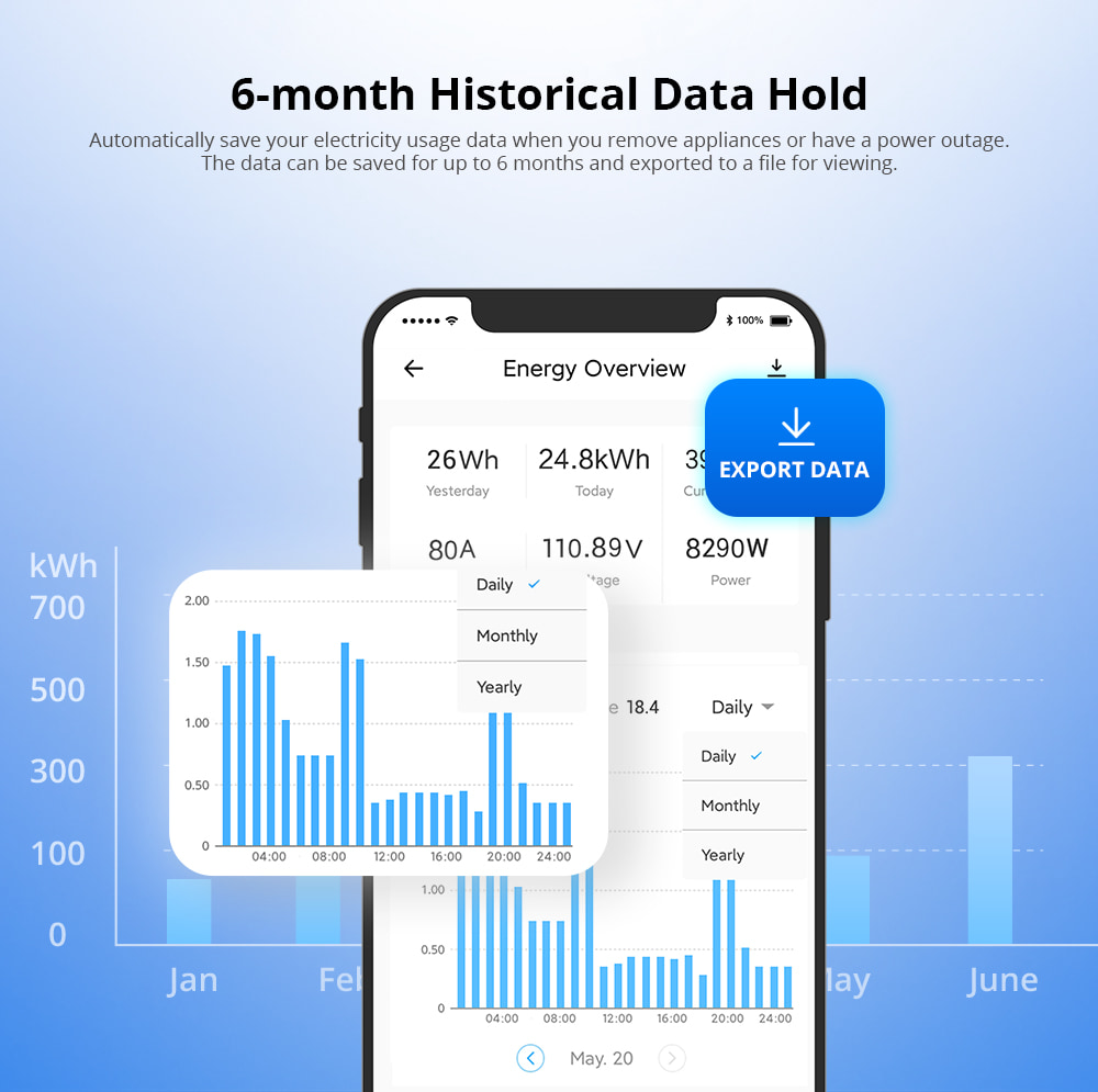 - 6-month Historical Data Hold : Automatically save your electricity usage data when you remove appliances or have a power outage. The data can be saved for up to 6 months and exported to a file for viewing.