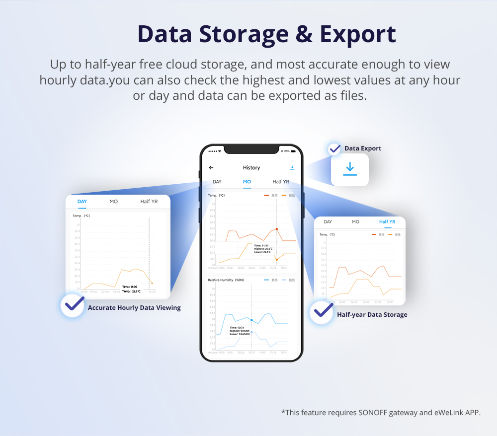- Up to half-year free cloud storage, and most accurate enough to view hourly data, you can also check the highest and lowest values at any hour or day and data can be exported as files