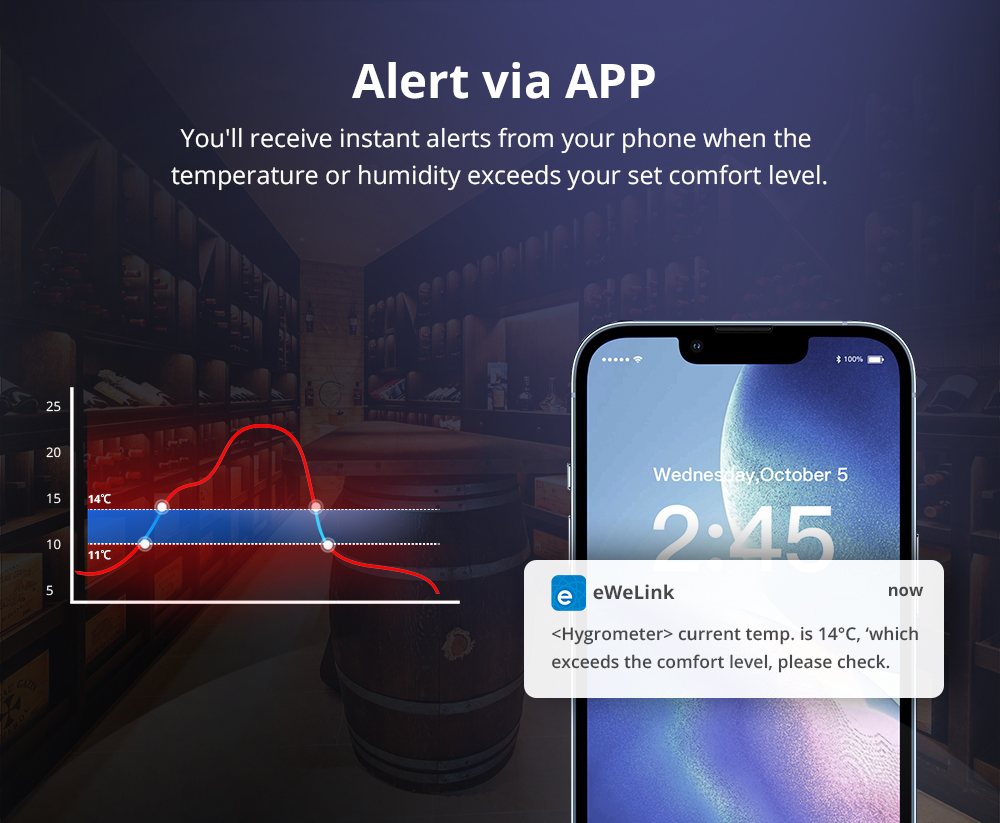 - You’ll receive instant alerts from your phone when the temperature or humidity exceeds your set comfort level