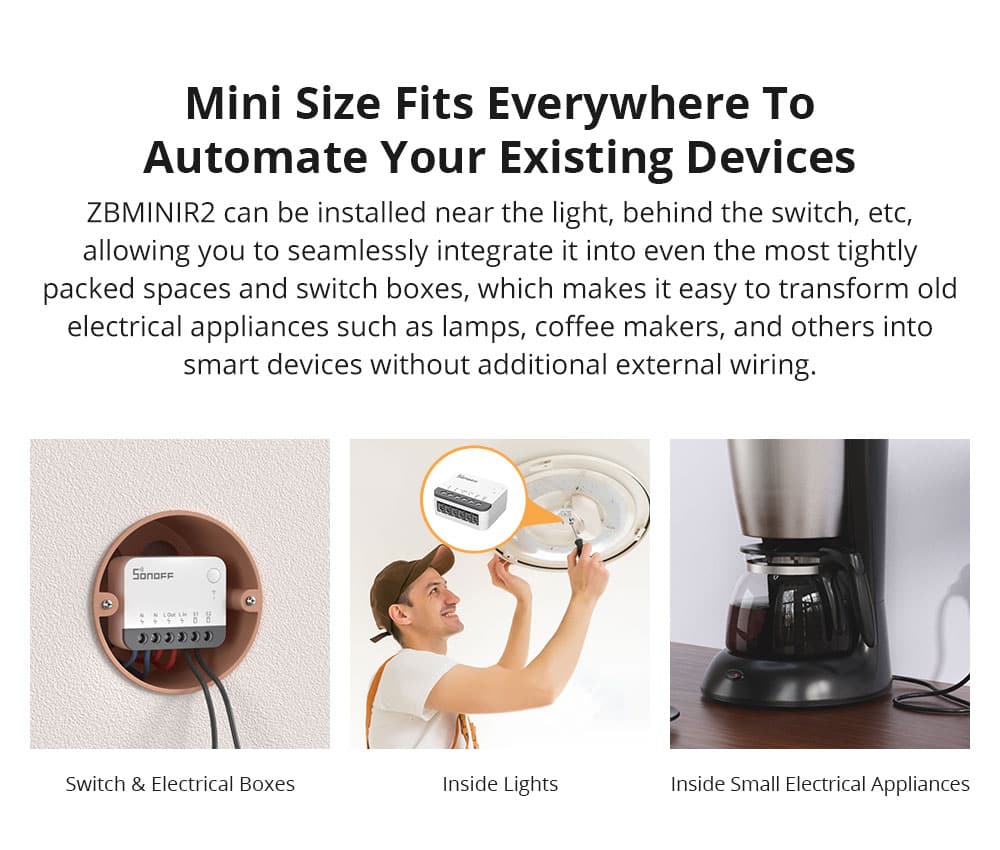 - SONOFF ZBMINIR2 is an extremely compact Zigbee 3.0 smart switch, capable of being installed in EU-type/86 type/120 type mounting box and supporting a maximum load of 10A, compatible with various external switch types, upgrading your traditional external switch into a smart one, seamlessly integrating smart technology into your home for enhanced convenience and control.