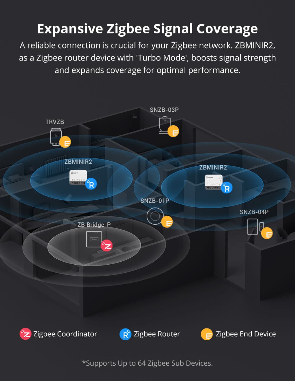 - A reliable connection is crucial for your Zigbee network.ZBMINIR2, as a Zigbee router device with Turbo Mode’, supports extending up to 64 Zigbee end devices, boosts signal strength, and expands coverage for optimal performance.