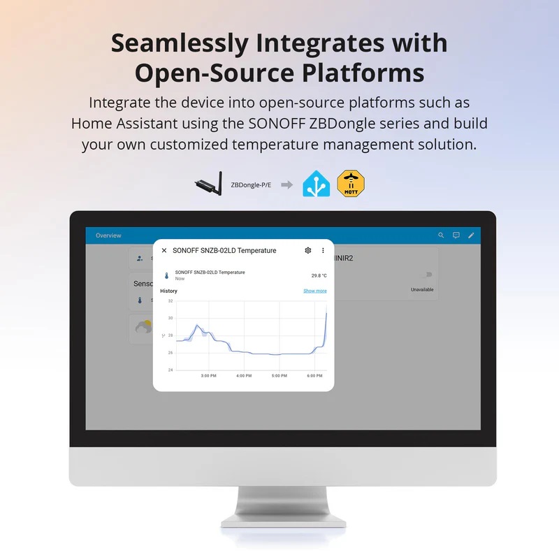 - SNZB-02LD supports Zigbee hubs using the Zigbee 3.0 protocol, like SONOFF iHost, NSPanel Pro, ZBBridge-P, ZBBridge-U, ZBDongle-E, ZBDongle-P, Echo 4th Gen, Echo Show 2ndGen, and Echo Plus 2nd. ..You can integrate the SNZB-02LD into open-source platforms such as Home Assistant using the SONOFF ZBDongle series and build your own customized temperature management solution.